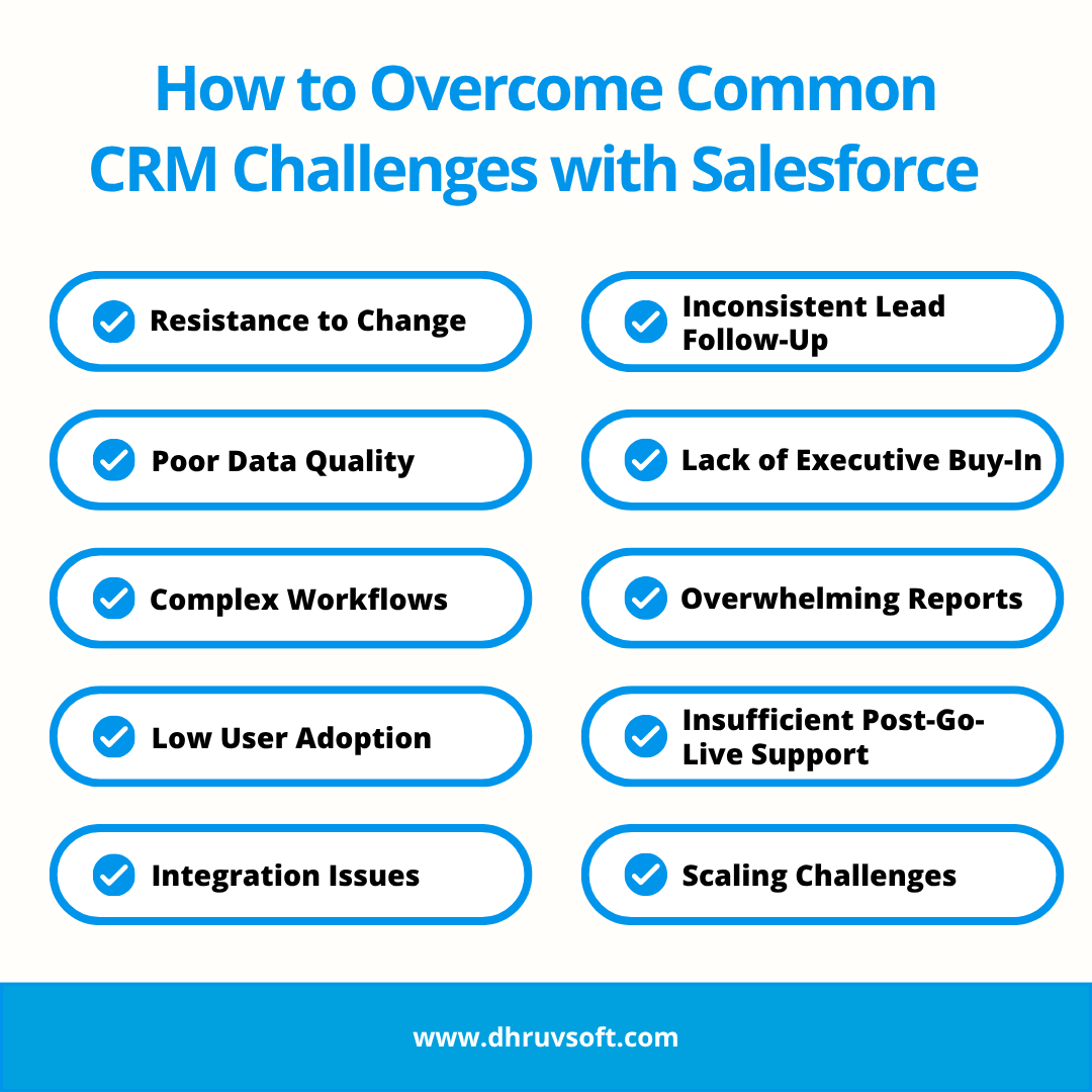 Solution: Plan for periodic Salesforce audits, performance reviews, and admin maintenance cycles. Dhruvsoft can provide continuous support to ensure configurations remain aligned with evolving sales processes, ensuring your CRM continues delivering value long after implementation.