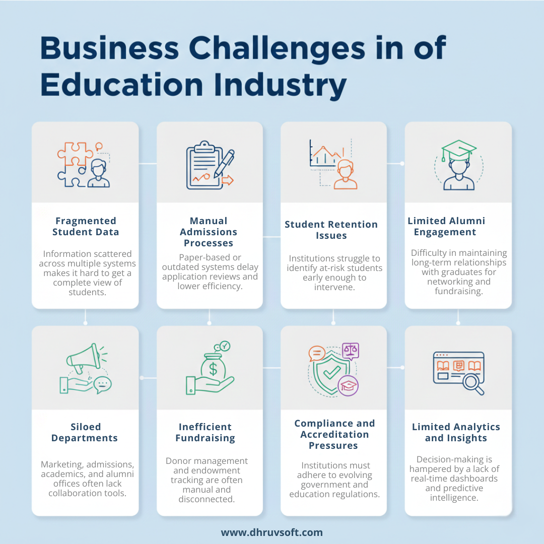 - Siloed Departments – Marketing, admissions, academics, and alumni offices often lack collaboration tools.